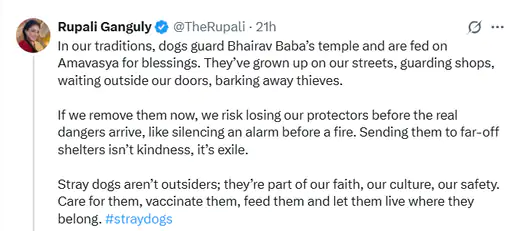 दरअसल, रुपाली ने एक पोस्ट शेयर कर लिखा था, ‘हमारी संस्कृति में कुत्ते भैरव बाबा की मंदिर की रक्षा करते हैं और आशीर्वाद के लिए अमावस्या में उन्हें खाना खिलाया जाता है। वो सड़कों पर बड़े होते हैं, वो दुकानों की रक्षा करते हैं, हमारे दरवाजे के बाहर इंतजार करते हैं, चोरों को भौंककर भगाते हैं। अगर हम उन्हें अभी हटा देंगे, तो जब असल खतरा होगा जैसे फायर अलार्म को बंद करना तो हम अपनी सुरक्षा को खोने का खतरा उठा रहे हैं। उन्हें दूर-दराज के आश्रयों में भेजना दया नहीं, बल्कि निर्वासन है।