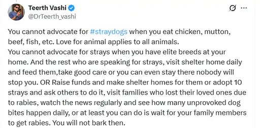 रुपाली की पोस्ट के जवाब में एक शख्स ने लिखा है, ‘जब आप चिकन, मटन, बीफ, मछली वगैरह खाते हैं, तो आप आवारा कुत्तों की वकालत नहीं कर सकते। जानवरों के प्रति प्रेम सभी जानवरों पर लागू होता है। जब आपके घर में उच्च नस्ल के कुत्ते हों, तो आप आवारा कुत्तों की वकालत नहीं कर सकते। और बाकी जो आवारा कुत्तों के लिए बोल रहे हैं, वे रोजाना आश्रय गृह जाएं और उन्हें खाना खिलाएं, उनकी अच्छी देखभाल करें या आप वहा रह भी सकते हैं, कोई आपको रोकेगा नहीं। या फिर पैसे जुटाएं और उनके लिए आश्रय गृह बनाएं या 10 आवारा कुत्तों को गोद लें और दूसरों से भी ऐसा करने को कहें, उन परिवारों से मिलें जिन्होंने रेबीज के कारण अपने प्रियजनों को खो दिया है, नियमित रूप से समाचार देखें और देखें कि रोजाना कितने अकारण कुत्ते काटते हैं, या कम से कम आप अपने परिवार के सदस्यों को रेबीज होने का इंतजार कर सकते हैं। तब आप भौंकेंगे नहीं।