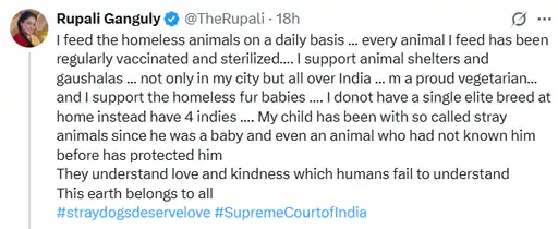 इसके जवाब में रुपाली ने लिखा है, ‘मैं रोजाना बेघर जानवरों को खाना खिलाती हूं, मेरे द्वारा खिलाए गए हर जानवर का नियमित रूप से टीकाकरण और नसबंदी की जाती है, मैं पशु आश्रयों और गौशालाओं का समर्थन करती हूं, न केवल अपने शहर में, बल्कि पूरे भारत में, मुझे गर्व है कि मैं शाकाहारी हूं और मैं बेघर फर वाले बच्चों का समर्थन करती हूं, मेरे घर में एक भी उच्च-स्तरीय नस्ल के जानवर नहीं हैं, बल्कि चार भारतीय नस्ल के जानवर हैं, मेरा बच्चा बचपन से ही तथाकथित आवारा जानवरों के साथ रहा है और यहां तक कि एक जानवर, जिसने उसे पहले कभी नहीं जाना था, ने भी उसकी रक्षा की है। वे प्रेम और दया को समझते हैं, जिसे मनुष्य समझने में असमर्थ हैं। यह धरती सभी की है।’