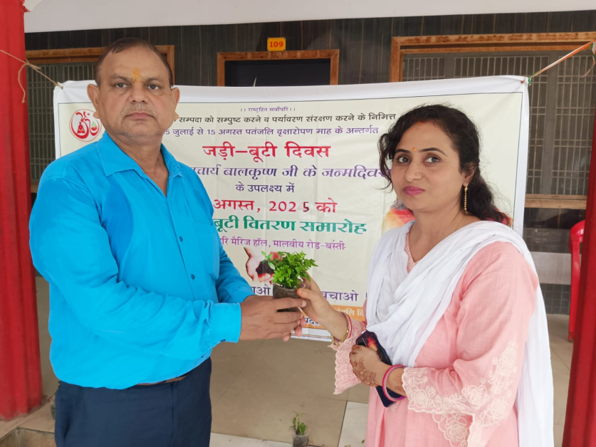 बेल के गुणों बताते हुए कहा कि बेल बी पी को नियंत्रित करने में महत्वपूर्ण भूमिका निभाता है। इसका फल तो मानव के लिए अमृत समान है। सुभाष चन्द्र आर्य ने जिला प्रभारी पतंजलि योग समिति बस्ती ने बताया कि योग और आयुर्वेद आरोग्यता का मूल है आज जो लोग अंग्रेजी दवाओं से थक गये हैं या गरीबी के कारण दवाइयों का खर्च उठाने में अक्षम हैं वे योग करके एवं अपने पास पायी जाने वाली औषधियों से सहज में ही ठीक हो सकते हैं। इसी कड़ी में डॉ वीरेन्द्र त्रिपाठी महामंत्री पतंजलि योग समिति बस्ती ने कहा कि आचार्य जी ने आयुर्वेद की बुझती ज्योति को पुनः तेज किया और पूरे संसार में पतंजलि चिकित्सालय एवं आरोग्य केन्द्रों के माध्यम से फैलाया जिससे जनता को अंग्रेजी दवाओं का एक मजबूत विकल्प प्राप्त हुआ है। साथ ही अन्य स्वदेशी उत्पादों को बाजार में लाकर विदेशी का बहिष्कार करने का अस्त्र भी लोगों को प्रदान किया है। इसके पश्चात आयुर्वेदिक औषधीय पौधों जैसे नीम, तुलसी, गिलोय, देशी गेंदा, सदाबहार, बेल, घृतकुमारी आदि का वितरण किया गया। इसके अलावा हरैया में कौशलेन्द्र विक्रम सिंह भानपुर में सुभाष चन्द्र सोनी व घनश्याम सिंह रूधौली मेंअनिल कुमार श्रीवास्तव ने जड़ी बूटी का वितरण किया।