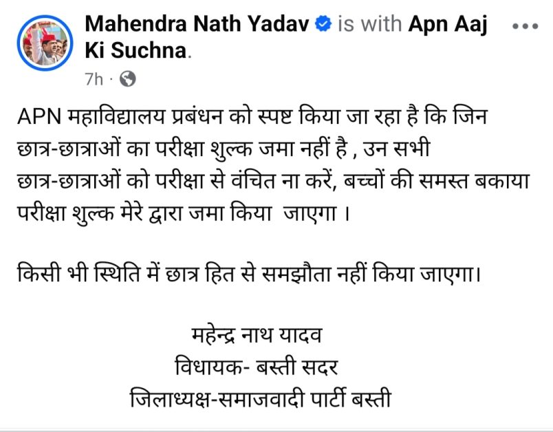 बस्ती जिले के APN महाविद्यालय के छात्रों के लिए एक बड़ी राहत की खबर सामने आई है। समाजवादी पार्टी के जिलाध्यक्ष एवं बस्ती सदर विधायक महेन्द्र नाथ यादव ने कॉलेज प्रशासन को निर्देशित किया है कि कोई भी छात्र केवल परीक्षा शुल्क न जमा कर पाने की वजह से परीक्षा से वंचित न रहे।