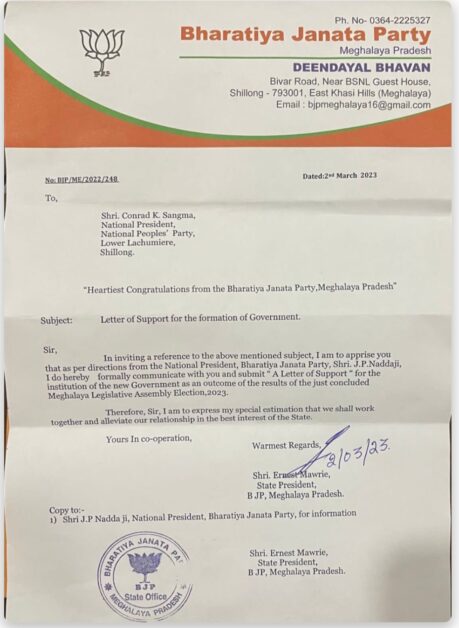 NPP has got 26 seats in its account, which is 4 seats less than the majority. In such a situation, once again BJP and NPP have come together.You can also see BJP’s support letter to NPP.