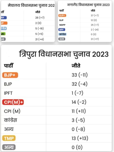 Election Results : The Election Results of the Legislative Assemblies of the 3 North Eastern States of India have come tomorrow i.e. on 2nd March. In which BJP again got majority in Tripura and Nagaland. Let us tell you that the BJP alliance got 37 seats in Nagaland and 33 seats in Tripura. NPP party has become the major party of Chief Minister Conrad Sangma in Meghalaya.