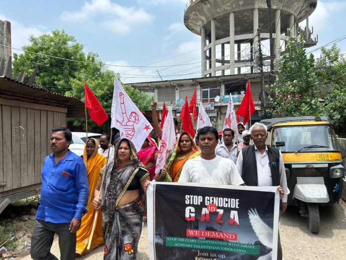 बस्ती। वाम दलों के आहवान पर गाजा में नरसंहार रोके जाने इजरायल को युद्ध अपराधी घोषित किए जाने, फिलिस्तीन के साथ एकजुटता प्रदर्शित करने के देशव्यापी अभियान के क्रम में जनपद में मार्क्सवादी कम्युनिस्ट पार्टी, भारतीय कम्यूनिस्ट पार्टी सहित नागरिक संगठनों के नेता, पदाधिकारियों ने न्याय मार्ग से जुलूस निकाल कर जिलाधिकारी कार्यालय बस्ती पर प्रदर्शन करते हुए राष्ट्रपति को चार सूत्रीय मांग पत्र सौंपा।