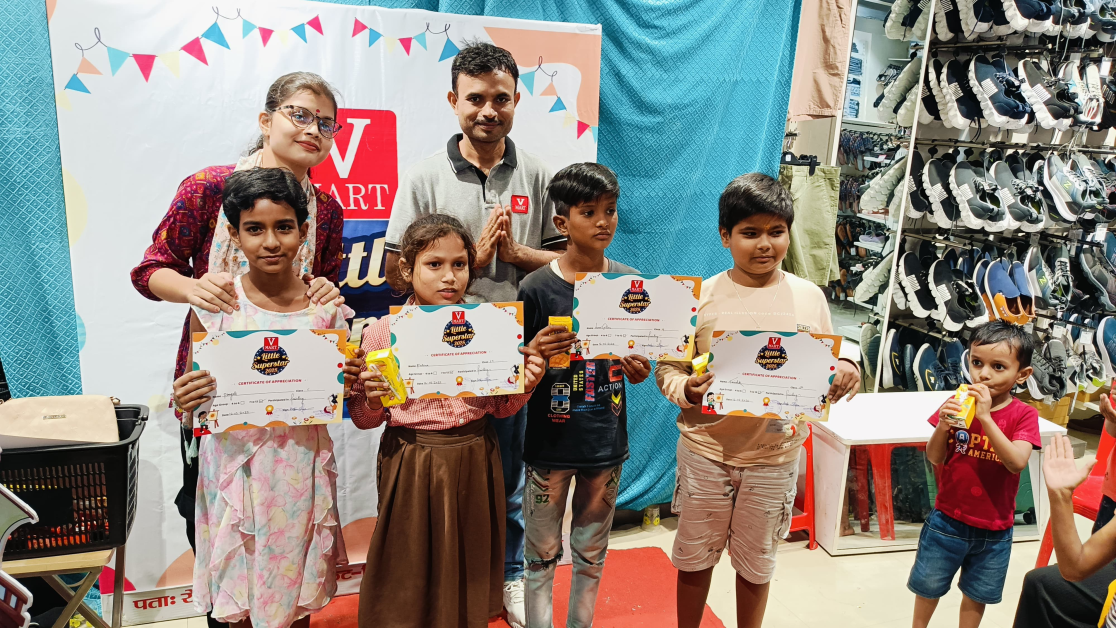 प्रतियोगिता के मंडल के रूप में मास्टर शिव, आंशि ने बच्चो के प्रतिभा का अवलोकन कर उनको प्रशस्तिपत्र , एवम उपहार देकर उनका उत्साह वर्धन किया, मास्टर शिव ने बताया कि, V मार्ट, केवल फ़ैशन,खाद्य पदार्थो, और उपकरणों पर है नहीं बल्कि,कला और संस्कृति,के संरक्षण में भी कार्य कर रहा हैं