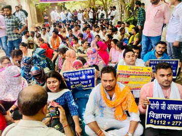 प्रयागराज: उत्तर प्रदेश में प्राथमिक शिक्षक भर्ती को लेकर एक बार फिर अभ्यर्थियों में रोष भड़क उठा है। पिछले सात वर्षों से नई प्राथमिक शिक्षक भर्ती न आने से निराश डीएलएड/बीटीसी प्रशिक्षित अभ्यर्थी प्रयागराज में ‘महाधरना’ दे रहे हैं। अभ्यर्थियों का आरोप है कि योगी सरकार सिर्फ वादे करती है, लेकिन ज़मीनी स्तर पर कुछ भी नहीं करती।