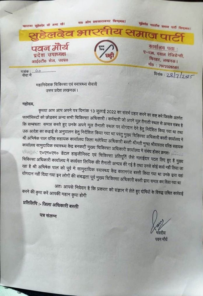 बस्ती । सुहेलदेव भारतीय समाज पार्टी आई.टी. सेल के प्रदेश उपाध्यक्ष पवन मौर्य ने महानिदेशक चिकित्सा एवं स्वास्थ्य सेवायें और जिलाधिकारी को पत्र देकर कहा है कि बस्ती जनपद में फार्मासिस्टो को छोड़कर चिकित्साधिकारी, कर्मचारियों को मूल तैनाती स्थल पर भेजे जाने के आदेश की धज्जियां उड़ायी जा रही है। मानकों का पालन न होने से स्वास्थ्य सेवायें प्रभावित हो रही है।