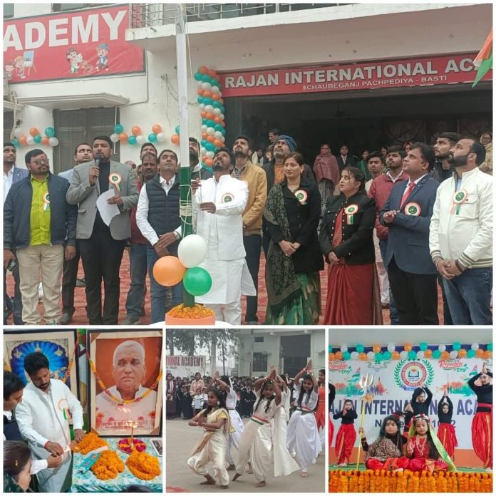 राजन इंटरनेशनल एकेडमी में 76वें गणतंत्र दिवस का पर्व उत्साहपूर्वक और सांस्कृतिक कार्यक्रमों की धूम के साथ मनाया गया। मुख्य अतिथि खलीलाबाद, संत कबीर नगर के पूर्व विधायक दिग्विजय नारायण चतुर्वेदी “जय चौबे” ने ध्वजारोहण के पश्चात छात्रों को संबोधित करते हुए स्वतंत्रता संग्राम, बलिदानों और 26 जनवरी 1950 को लागू हुए संविधान के महत्व पर प्रकाश डाला। उन्होंने इसे भारत के लिए ऐतिहासिक दिन बताया और सभी से स्वतंत्रता सेनानियों के सपनों को पूरा करने का संकल्प लेने का आह्वान किया।