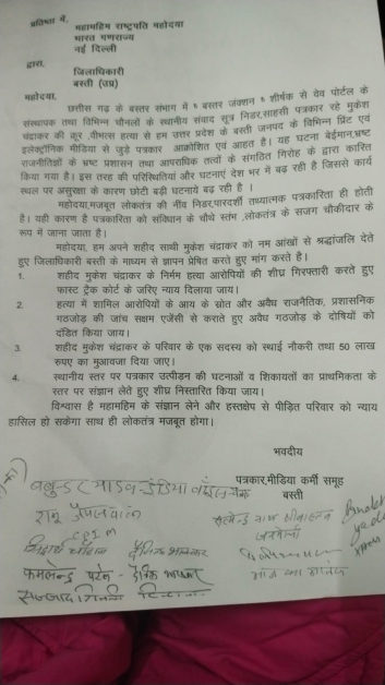 बस्ती के पत्रकारों ने मुकेश चंद्राकर की हत्या पर निम्न मांगे रखी हैं: