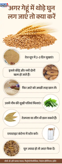 जवाब- बरसात में अगर गेहूं में कीड़े नजर आएं तो सीधा फेंकने की जरूरत नहीं है। कुछ आसान तरीके अपनाकर आप इसे दोबारा इस्तेमाल लायक बना सकते हैं। इसे नीचे दिए ग्राफिक से समझिए-