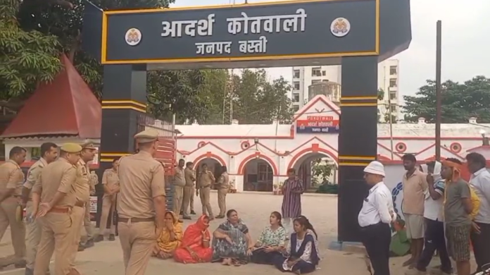 कोतवाली गेट पर महिलाएं आरोपियों की गिरफ्तारी को लेकर कर रही हैं मांग।
